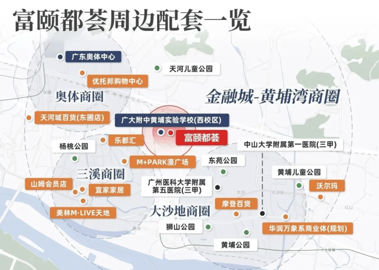 富颐都荟周边生态资源丰富,四大生态公园环绕,为业主提供天然氧吧与休闲去处。天河儿童公园距离项目车程约15分钟,是亲子互动的绝佳场所,园内配备丰富的儿童游乐设施,满足不同年龄段孩子的游玩需求;杨桃公园车程约10分钟,以成片杨桃树为特色,园内绿树成荫、流水潺潺,适合日常散步、休闲放松;狮山公园、黄埔公园车程均在20分钟内,园内景观优美,配套完善,是市民健身、娱乐、亲近自然的优选之地。