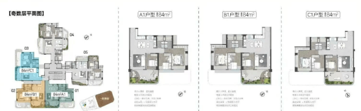 84㎡3房2卫:竖厅格局,客厅可以与次卧打通成为一个超级大方厅,南向面宽达12.4米,空中花园面积达20-24平方米。