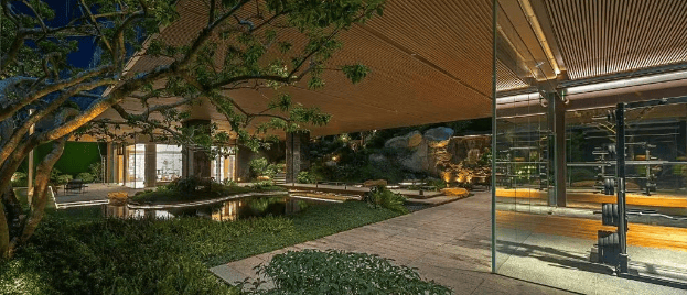 在许多人的印象中,天河区核心地段往往被高密度的建筑群所包围,难以寻觅自然山景。然而,越秀天河和樾府的地理位置打破了这一刻板印象。从珠江新城驱车前往白云山,走内环路通常仅需不到20分钟,而该项目实际上就坐落在白云山南麓的延伸带上。即便不开车,居民步行至云山脚下也仅需较短时间。这种“一扇窗望见东西塔,另一扇窗拥抱白云山”的景观视野,在广州中心城区极为罕见。项目充分利用了这一天然优势,在园林设计上顺应南北地势高差,打造了面积约1.5万平方米的中央大园林,其中包含约1300平方米的“榕樾山水会客厅”。园内保留了原有的十几棵大榕树,结合新建的遮阳廊架与休憩座椅,营造出层次丰富的生态微气候。对于长期生活在钢筋水泥森林中的都市人来说,推窗见绿、出门入园的生活场景,能够有效缓解工作压力,提升居住的舒适度与心理健康水平。