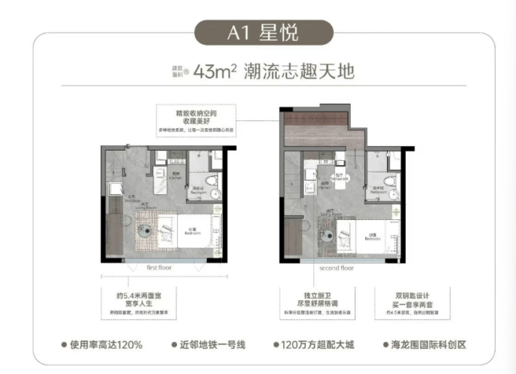 建面约43㎡南向双钥匙户型:南向开间约5.4米,进深约5.1米,同样具备双面宽优势。南向采光极佳,适合自住或作为高端租赁房源,租金回报率稳定。