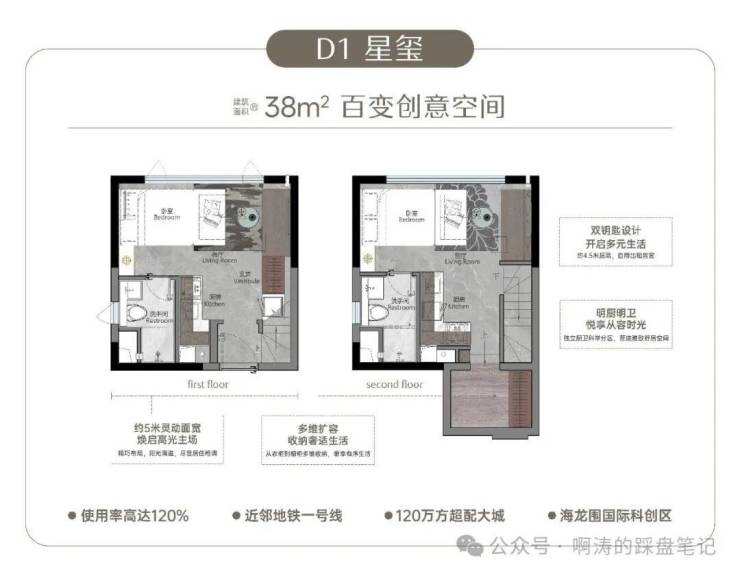 建面约38㎡双钥匙户型:开间约5.0米,进深约5.2米,近1:1的开间进深比,双面宽设计带来超阔视野。采用双钥匙设计,买一层得两层,独立入户,互不干扰,非常适合投资出租,实现双倍收益。