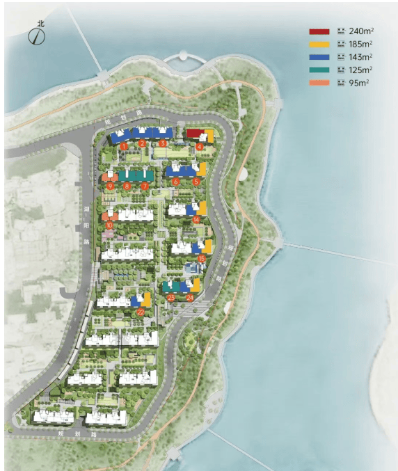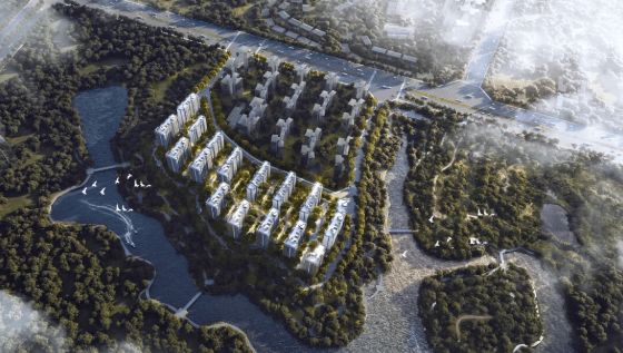 园林设计:一环两轴七景布局,7公里湖岸线及多重林荫界面,让居民尽享诗意生活。