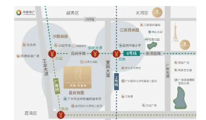 中旅天宸府坐落于广州市传统中心区海珠区昌岗中路 100 号,西邻工业大道北路,北接昌岗中路。距地铁 8 号线宝岗大道 C 出口站仅约 200 米,这种近地铁的优势使得居民能够快速接驳广州的各大核心区,无论是前往珠江新城、琶洲等商务区,还是其他生活休闲区域,都能高效抵达。此外,5 分钟即可上内环,进一步提升了全城通达性,满足了居民多样化的出行需求,无论是日常通勤还是外出游玩,都极为便利。