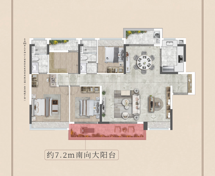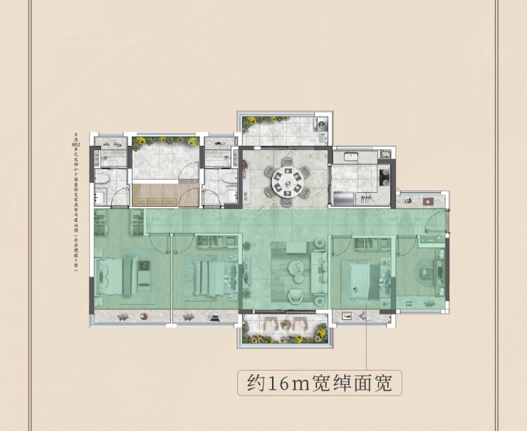 建面约115m²四房两厅两卫:四开间朝南,客餐一体设计,配备约6.6米宽南向景观阳台。