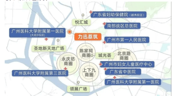 医疗配套方面,项目3公里范围内汇聚了7所三甲医院,包括广州市第一人民医院、广州医科大学附属第一医院、广东省妇幼保健院越秀院区、南部战区总医院、广州医科大学附属第三医院、广州市妇女医疗中心、广东省中医院等,均为广州顶尖的医疗机构。其中,广州市第一人民医院距离项目约2公里,自驾10分钟可达,为业主的健康提供全方位保障,尤其是老人和小孩就医更加便捷。