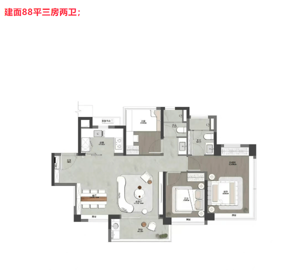 1. 约84-88㎡三房两卫:刚需首置的“神户型”