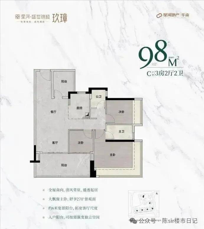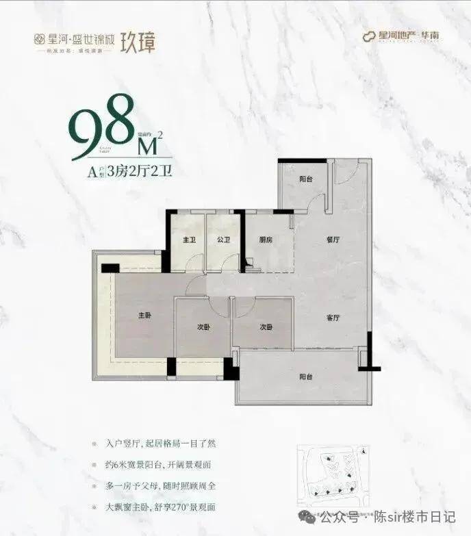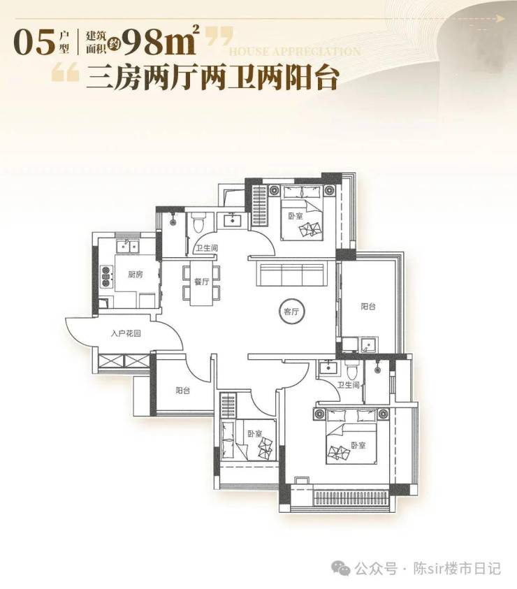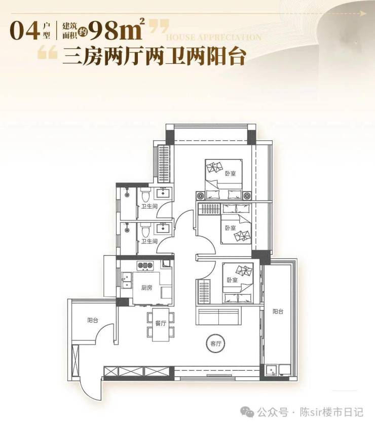 98㎡户型全新升级,主朝向朝南,让阳光洒满每一个角落。主卧配备 270° 无柱飘窗,视野开阔,美景尽收。次卧和阳台尺度大幅增加,提供更加舒适的居住体验,无论是休闲娱乐还是晾晒衣物都更加从容。