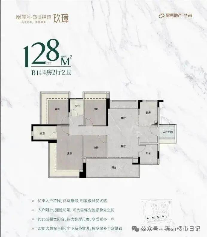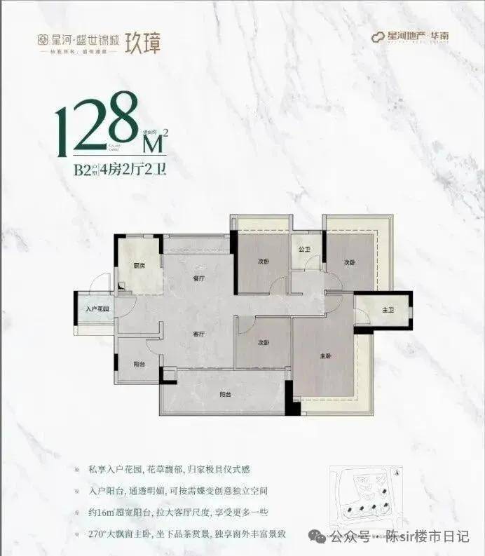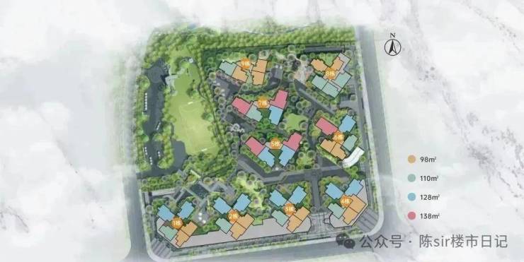有三个面积段,98-110-128㎡三至四+1房,共有5个户型,都是新规设计,实用率达100%以上。