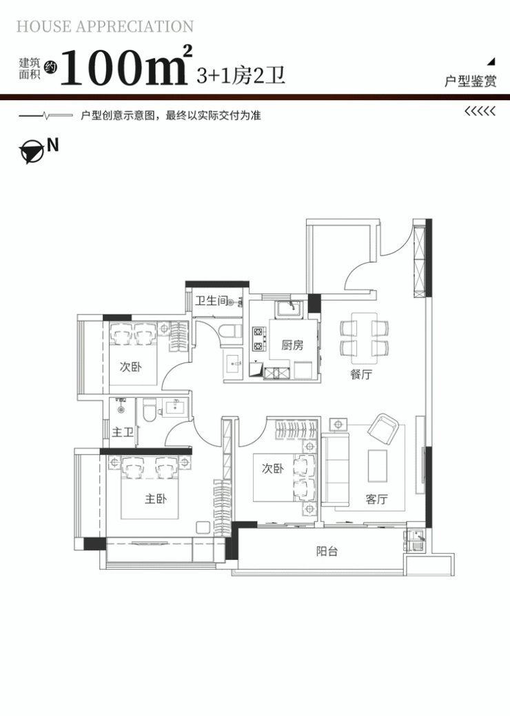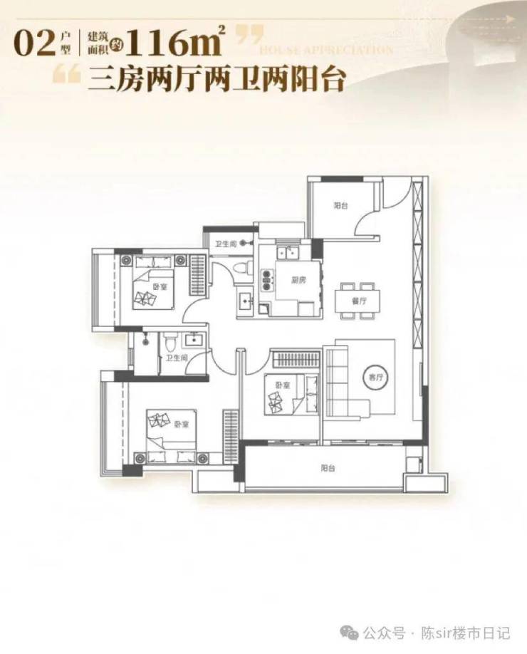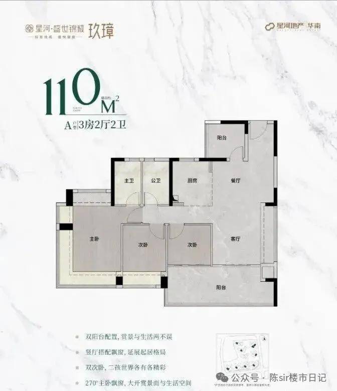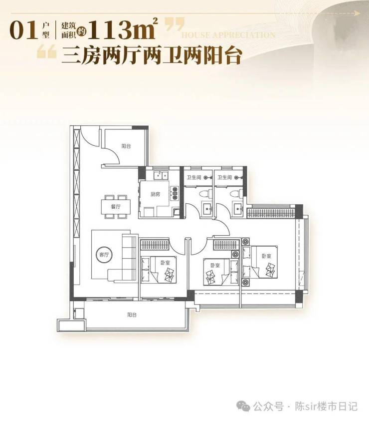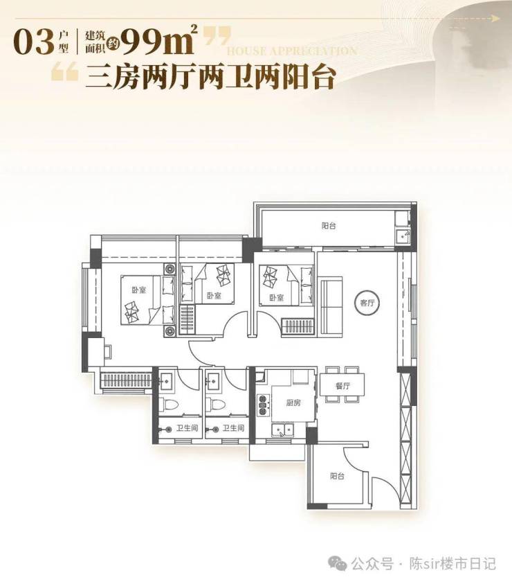 建面约110平3+1房,南北通透,双跨阳台开间也有6米。
