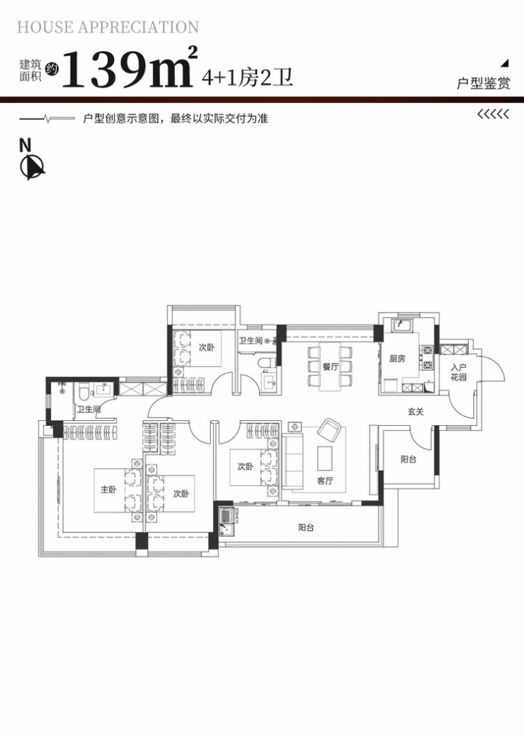 建面约139平3+1房,近3㎡的独立入户花园,收纳更从容,户型最大的亮点在于,270°南向主卧,无承重墙遮挡,约6.6米南向跑道式阳台,双厅面宽约4米,五开间朝南,南北通透。