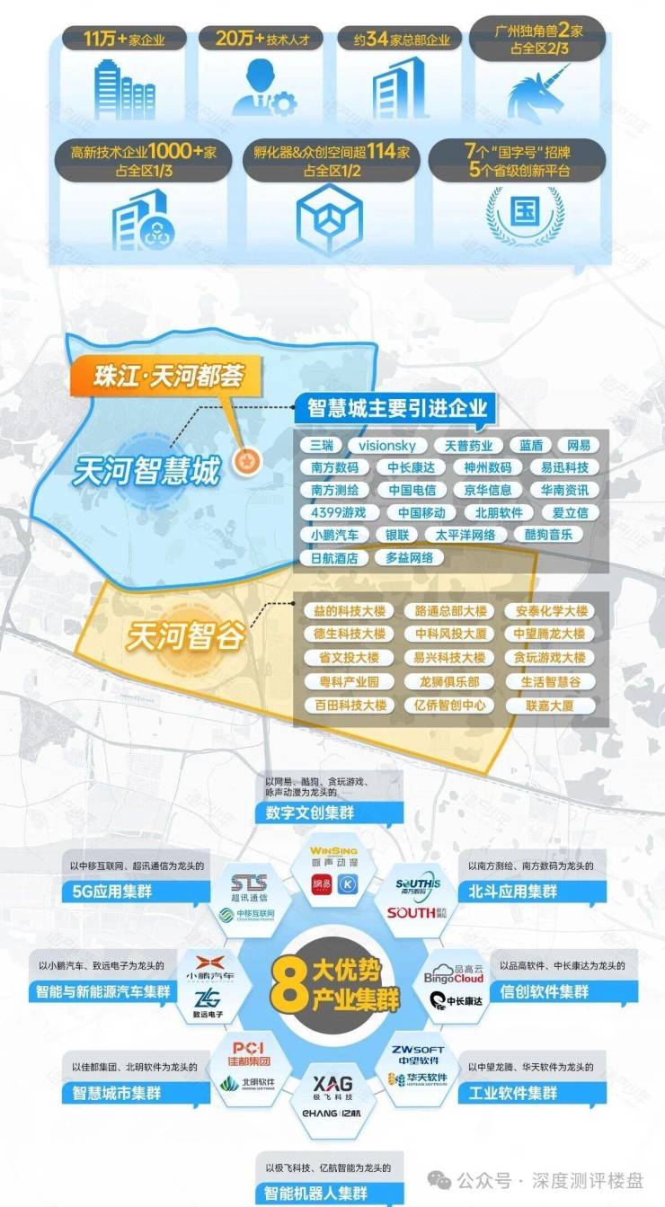 广州城市发展的脉络,正从传统中轴向科创活力轴跃迁,天河智慧城作为广深港澳科技创新走廊的核心节点,更是被定义为广州的 “硅谷”,成为城市高质量发展的主战场广州市天河...。根据广州市天河区人民政府官方发布数据,智慧城板块汇聚了网易、小鹏汽车等 3000 余家高新科技企业,拥有国家级高新区、省级高新区以及 7 个国家级创新发展平台,形成了数字创意、智能与新能源汽车、5G 应用与智慧城市、人工智能与轨道交通四大产业集群,科创实力拉满广州市天河...。