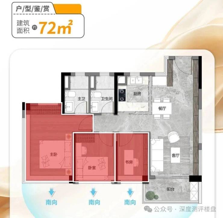 72㎡的三房两厅两卫,是项目的刚需爆款户型,总价仅 298 万起,就能实现上车天河的梦想,对于年轻的刚需家庭来说,性价比超高。这个户型采用全南向设计,保证了室内的采光和通风,让房间里充满阳光和鲜氧。