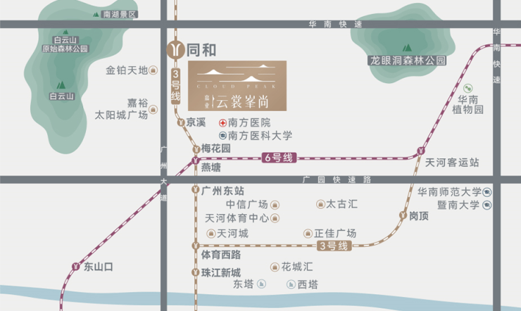 雄踞白云山与广州大道城市双中轴之上,地段价值不可复制。项目位于3号线同和地铁站旁,4站到天河中心,咫尺珠江新城