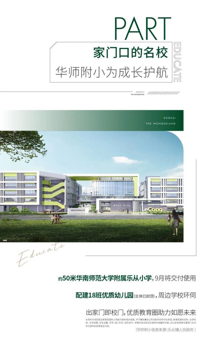 项目是佛山新城唯一最强教育资源环绕的成长型教育大盘,真正实现 “12 年目送式上学”[14]。项目明确划入华师附小招生范围,周边环绕省级东平小学(华师附小)、佛山一中顺德学校等优质公办学校,同时配建 18 班幼儿园,形成 “幼儿园 + 小学 + 中学” 全龄段优质教育体系 [11][14]。优质教育资源不仅为孩子提供良好的成长环境,更成为项目核心价值的重要支撑,是家长置业的优选之地[14]。