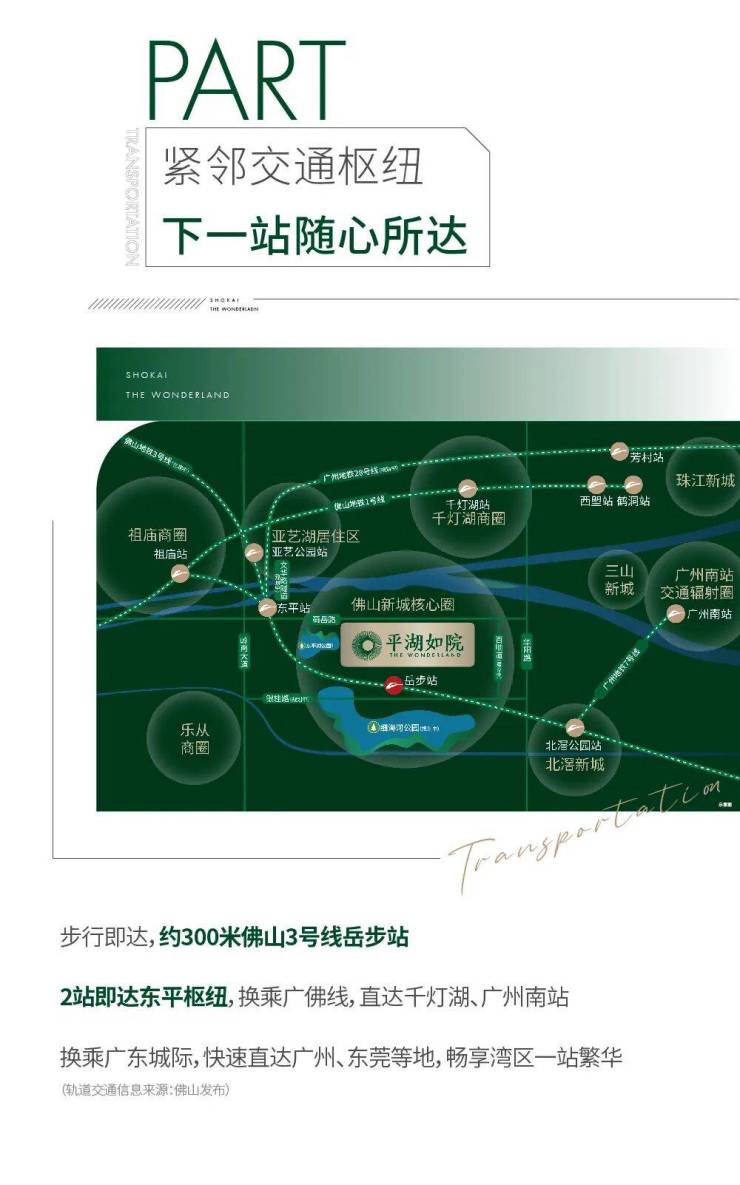 项目作为TOD 低密院墅,交通便利性堪称区域标杆 [12]。距离佛山地铁 3 号线岳步站仅约 300 米,步行 5 分钟即可直达地铁站,乘坐地铁可快速通达佛山全城 [11][14]。未来规划佛山地铁 14 号线通达亚艺、北滘商圈,2 站可换乘广佛线、广佛环线、广州地铁 28 号线等,无缝衔接广州核心区域,实现 “广佛同城 1 小时生活圈”[14]。