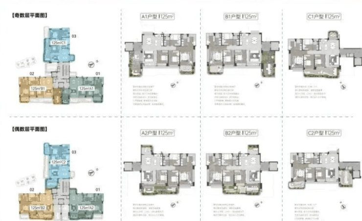 125㎡户型:横厅布局,6.8米景观阳台直面珠江,奇偶层露台设计(奇数层厅出露台约25㎡,偶数层主卧出露台约23㎡),实测隐私防护玻璃高度达1.95米。