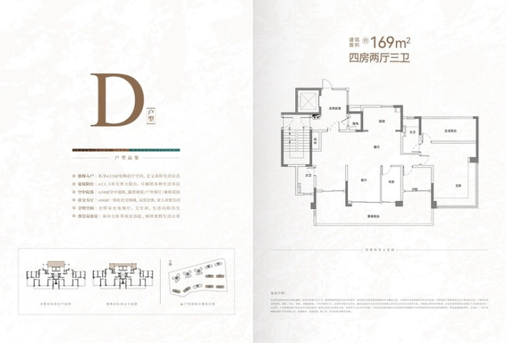 最后是169平方米的四房三卫户型,这款户型则是“奢华与阔绰”的代名词。它主打南北双庭院设计,最大公共空间面积约60平方米,庭院净高达到6.3米。如此高的层高,为空间改造提供了无限可能。业主可以将庭院打造成私人花园、家庭影院、瑜伽室或是多功能活动室,满足多元化的生活场景需求。约19.5米的南向大面宽搭配11.5米长的超长阳台,让每个房间都能充分采光,阳光洒满每一个角落。这款户型总价470万起,专为多人口家庭打造,无论是二胎家庭还是三代同堂,都能在这里享受到宽敞明亮的居住体验。四房三卫的布局,彻底解决了早晚高峰卫生间拥堵的问题,让家庭生活更加井然有序。