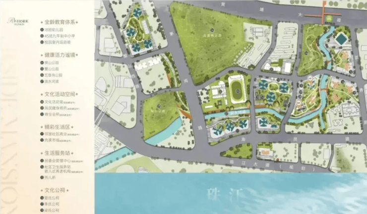 项目被蟹山公园、瓦壶岗公园、文冲山体公园环绕,推窗见绿,呼吸鲜氧。沿珠江打造的1.2公里滨水景观长廊,是晨跑、遛娃、散步的理想场所,真正实现“公园里的家”。