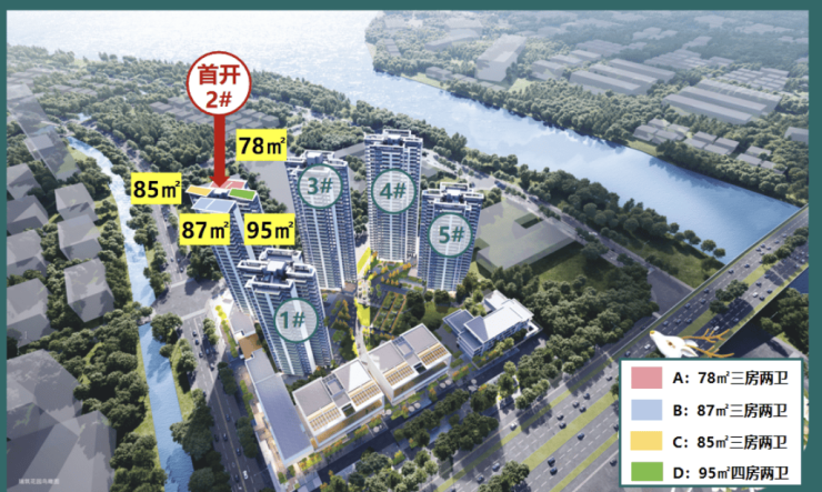 A:77-95㎡三至四房户型,实用率超110%,南北通透,高拓空间设计,部分高楼层可直面江景。