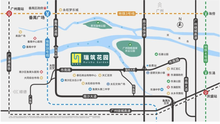 瑞筑花园位于南沙与番禺交界的桥头堡区域,地处南沙发展核心地段,同时靠近番禺区中心,享有双板块红利。项目周边交通便利,番禺广场车程约10分钟即可抵达,衔接3号线、18号线和22号线,实现与珠江新城、广州南站的快速通达。南沙政策红利叠加番禺成熟生活配套,使得区域发展潜力持续增长。无论是刚需家庭还是改善型购房者,瑞筑花园凭借区位优势和板块潜力,为投资与自住提供了双重保障。