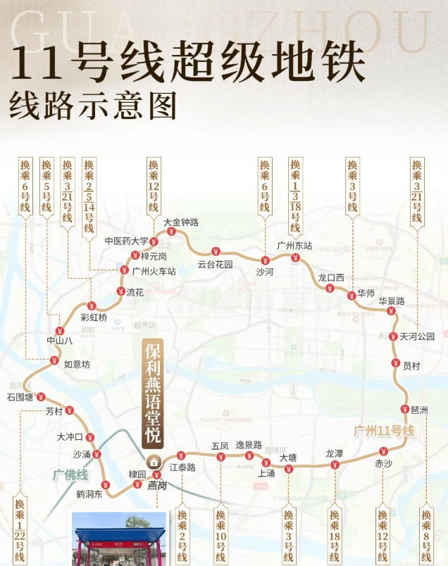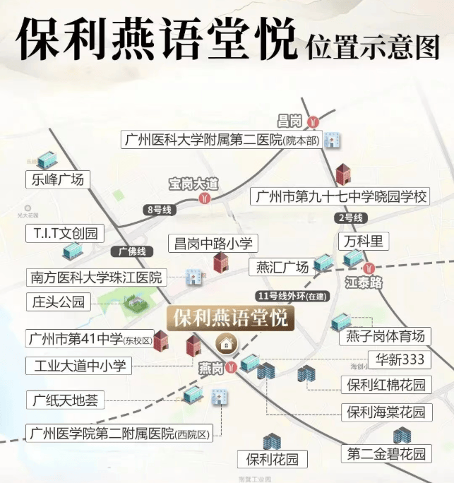 保利燕语堂悦距离燕岗地铁站非常近,步行几分钟即可到达。燕岗站不仅是广佛线的一个重要站点,同时也是在建中的11号线的交汇点,极大地提高了出行的便利性。同时,项目紧邻工业大道主干道,通过发达的路网,居民可以快速到达广州的核心区域和其他重要地点。