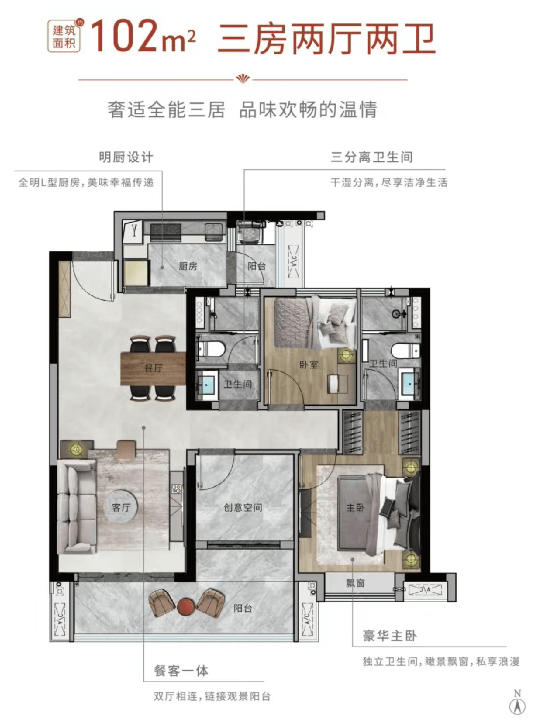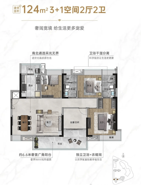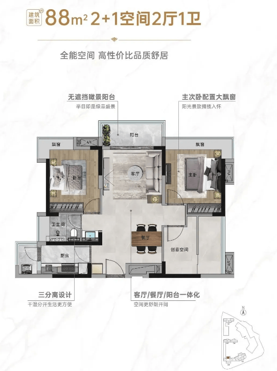 产品设计贴合刚需痛点:90% 户型为纯南向板楼,南北对流、全明通透,楼间距约 70 米,避免采光遮挡;在售 88-122㎡三至四房,88㎡户型三开间朝南 + 双阳台,124㎡横厅设计零过道浪费,实用率高。交标上配备正压新风、智能家居系统、厨余处理系统等,细节对标改善盘,在同价位刚需盘中属 “越级配置”。