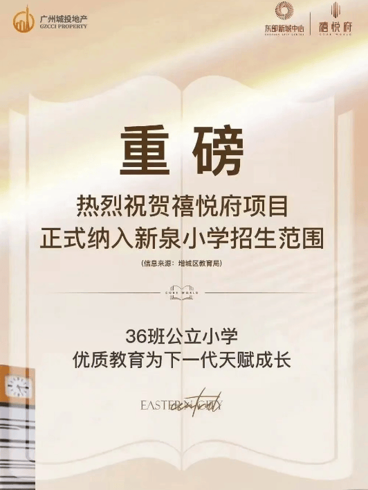 教育配套满足家庭需求,3 公里内覆盖新泉小学(东部枢纽配套小学)、新塘中学、广大附中增城校区等优质学校,其中新泉小学作为区域重点公立校,为孩子提供 “家门口” 的优质义务教育(具体入学以政策为准)。周边还有加蒙特国际幼儿园、凤凰城中英文学校等,从学前到中学形成全龄教育链,解决家长子女教育顾虑。