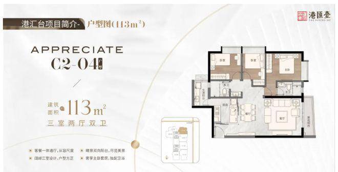 汉国置业・港汇台在此背景下应运而生,有望成为越秀区新的楼市标杆。项目由香港上市企业汉国置业打造,该企业历经 58 年,深耕湾区,致力于树立标杆人居。港汇台占地面积约 5400㎡,建筑面积约 36000㎡,梯户比为 C1 栋 2 梯 3 户,C2 栋 2 梯 4 户,物业由港汇物业(第一太平戴维斯物业顾问)提供,交标采用世界级一线品牌,品质卓越。
