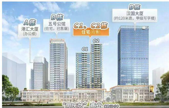 楼层情况:1 - 4 层为商业区并连通北侧汉国大厦写字楼,5 层架空,C1 栋住宅区高 20 层,C2 栋住宅区高 25 层