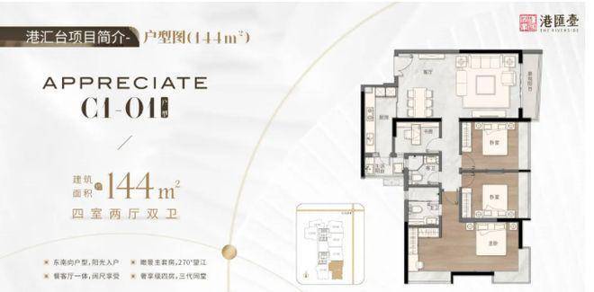144㎡四房两厅二卫:此户型为东南向,阳光可充足入户。餐客厅一体,营造出阔尺的活动空间,奢享级的四房设计适合三代同堂居住。瞰景主套房配备 270 度望江视野,让住户在家中就能欣赏到珠江的壮丽景色,享受惬意的江居生活。