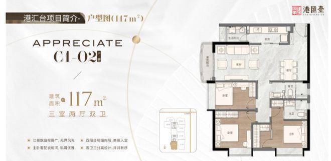 117㎡三房两厅两卫:阳台与飘台赋予了该户型广阔的视野,无界风光尽收眼底。主卧奢配衣帽间,私藏优雅,双阳台向阳设计,既能保证充足的采光,又能让美景入室。客卫三分离设计,使日常生活更加井井有条。