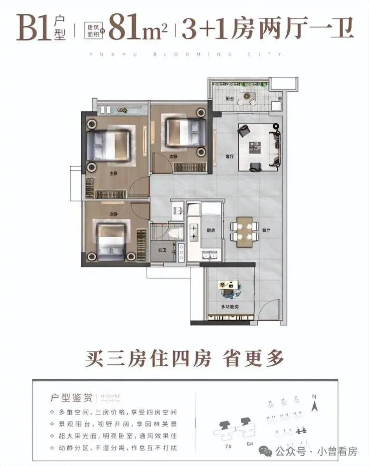 高性价比的全龄段人居N+1户型,户型涵盖约70-140㎡三-六房。
