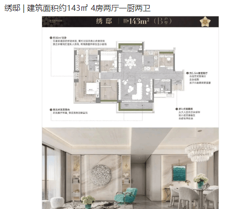 绣邸:建筑面积约143㎡,四房两厅一厨两卫。