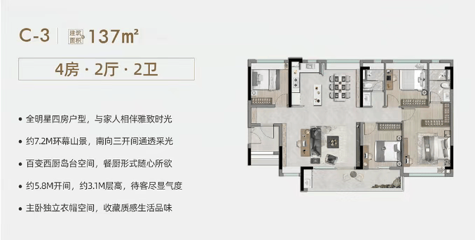 客厅与餐厅相连,形成阔绰活动空间,搭配大面宽景观阳台,既能满足家庭日常活动需求,又能欣赏户外山景与园林风光。主卧为套间设计,配备步入式衣帽间与独立卫生间,提升居住私密性与舒适度;其余房间空间大小适中,可根据需求改造为儿童房、书房、长辈房等,灵活性强。建面约137㎡四房两厅三卫,属于高端改善户型,空间尺度更为阔绰,适合多人口家庭居住。