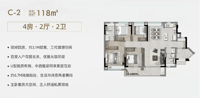 该户型布局方正,空间利用率高,采用全明设计,客厅连接景观阳台,主卧配备独立卫生间与飘窗,最大化引入阳光与山景,让小户型也能享受充足采光与景观视野。厨房采用U型布局,操作空间充足,方便多人协作,同时预留充足储物空间,满足家庭日常收纳需求。建面约118㎡四房两厅两卫,适配改善型家庭,户型南北通透,通风采光俱佳,整体空间开阔不压抑。