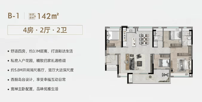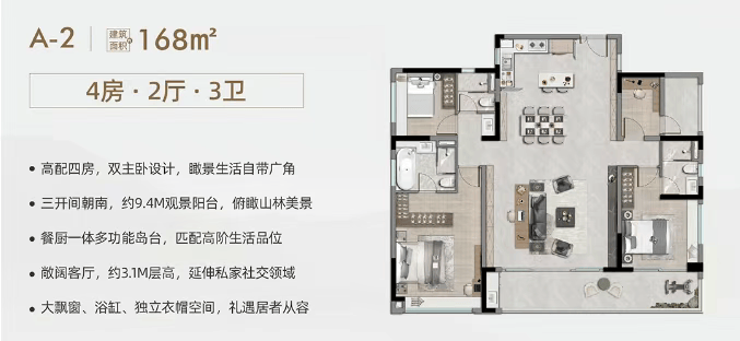 该户型采用大面宽、短进深设计,采光面最大化,全屋多飘窗设计,每个房间都能享受充足光线与景观视野。客厅阔绰大气,搭配全景阳台,尽显居住格调;双主卧套间设计,满足长辈与主人的私密性需求,同时配备独立卫生间与衣帽间,提升居住质感。厨房与餐厅相连,动线合理,同时预留中西厨改造空间,适配多元饮食需求。
