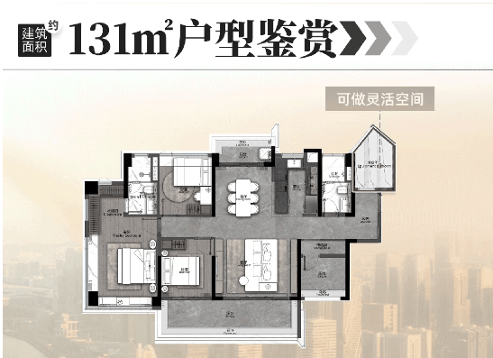 建面约 123㎡打造 4 + 1 房,四开间朝南,6.5 米双面宽景观阳台,采光通风俱佳。“魔方空间” 灵活多变,设备空间、厅卧可改造,厅卧合并能成约 62㎡ LDKG 大方厅。该户型还可南望海珠湿地公园,享稀缺景观。约 131㎡户型入户拐角玄关设计,南北对流双阳台,南向阳台长约 7.5 米,LDKG 一体化设计拓展生活场景,主套 L 型衣帽间与环幕大飘窗,提升居住体验。