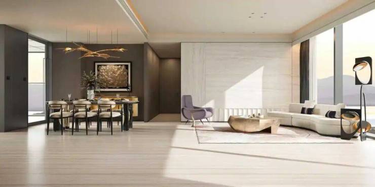 值得一提的是,项目采用3梯2户布局,其中两台电梯为双开门设计,实现真正意义上的平层入户。玄关做了双通道处理:家人回家直入起居区,客人或保洁则从另一侧进入公共活动区。这种动线分离在大户型中尤为实用,既保护隐私,又避免高峰期等电梯的尴尬。层高约3.5米,不仅视觉更开阔,也为后期加装新风或智能轨道预留了空间。