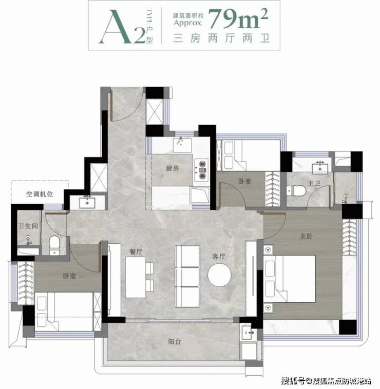 79㎡三房两卫:南向全明格局,主卧带飘窗,得房率120%(相当于传统95㎡空间);