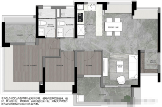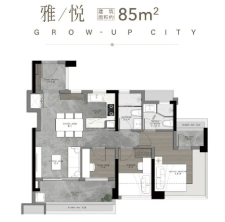 建面约86㎡三房两卫:适合三口之家,南向四开间,约11.1米采光,跑道式阳台。