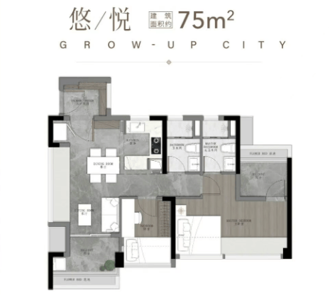 建面约75㎡三房两卫:适合年轻家庭,四开间朝南,开放式厨房,南北对流主套。