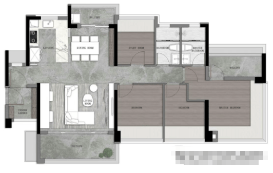 建面约103㎡四房两卫:适合三代同堂,五开间约14米采光,开放式厨房,270°无立柱转角阳台。