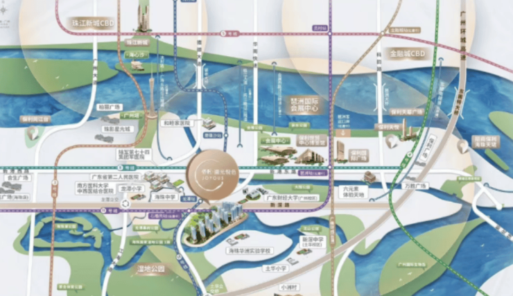 保利湖光悦色位于海珠区华洲路旁,处于海珠南核心板块,紧邻琶洲商务区与珠江新城 CBD,享受两大核心区域的辐射带动。随着琶洲数字经济产业的快速发展,区域产业升级加速,人口吸引力不断提升,住房需求也随之增加,而项目作为区域内少有的低密现房项目,具备较强的竞争力。