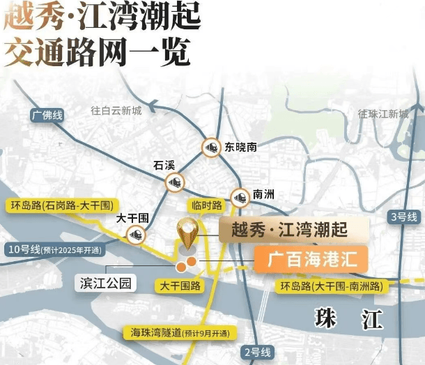 项目距离地铁10号线大干围站仅约650米,通过该线路可以方便地到达珠江新城、体育西等核心商务区。此外,附近的海珠湾隧道预计将于今年开通,届时前往广州南站的通勤时间将缩短至约15分钟。项目门口的环岛路(石岗路-大干围路段)也将于今年开通临时道路,进一步提升区域通行效率。