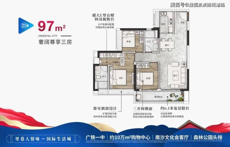 98平方米三房:南北通透,双卫设计,主卧套房带独立衣帽间,满足三代同堂需求;