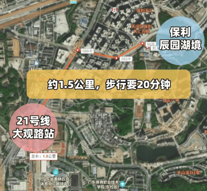 根据广州市住建局备案信息及项目官方公示,保利辰园湖境距离地铁21号线大观南路站约1.5公里,步行需15-20分钟,这个距离不算太远,日常步行即可到达,也可以选择骑行,10分钟左右就能抵达地铁站,对于上班族来说十分便捷。