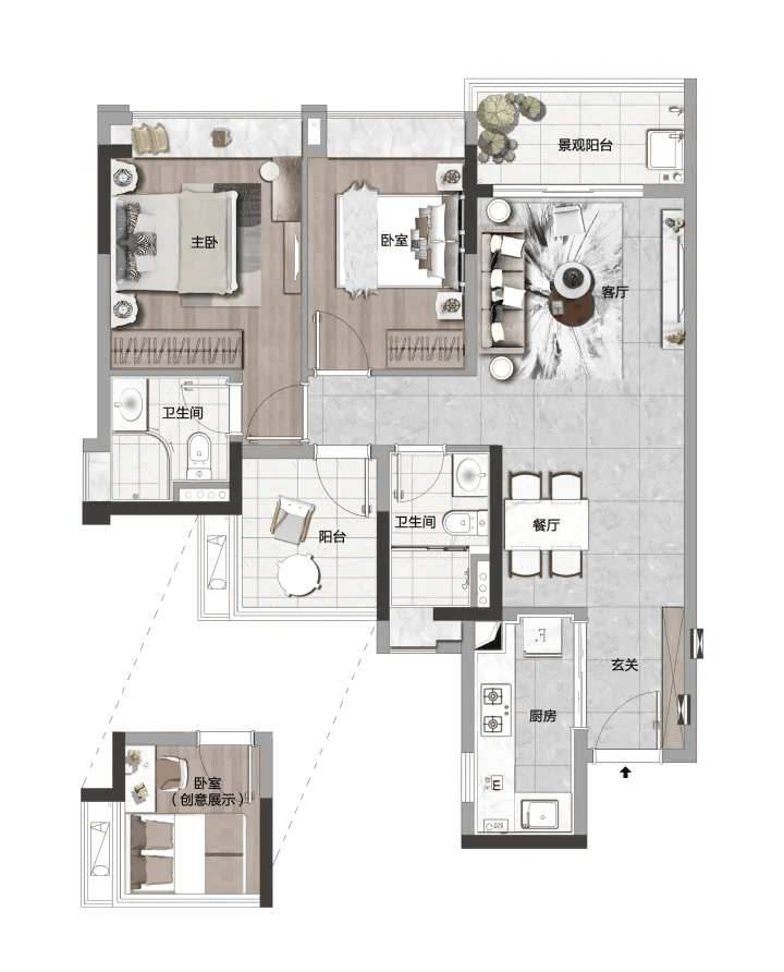 C户型建面约106㎡,D户型建面约107㎡,均为创意四房两厅两卫。这两款户型空间开阔,布局方正,能够满足多人口家庭的居住需求。客厅宽敞明亮,与餐厅相连,形成通透的公共活动空间,适合家庭聚会与日常休闲。卧室空间充足,采光通风良好,每间卧室都配备了充足的收纳空间。厨房采用U型设计,操作空间充足,动线合理,让烹饪更加便捷。