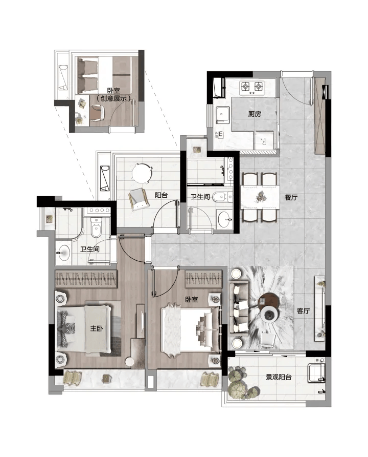 A户型与B户型均为建面约88㎡的创意三房两厅两卫,两款户型布局紧凑合理,空间利用率高。采用罕见的户户单边、三面采光设计,南北对流,通风采光效果极佳。宽厅连接景观阳台,能够将流溪河的一线美景引入室内,让业主在客厅就能欣赏到自然风光。全屋配备飘窗飘台,增加了空间的拓展性,同时预留了13大科学实用的收纳空间,有效解决了小户型的收纳难题。豪华酒店式主卧套房设计,为业主提供私密、舒适的休息环境。