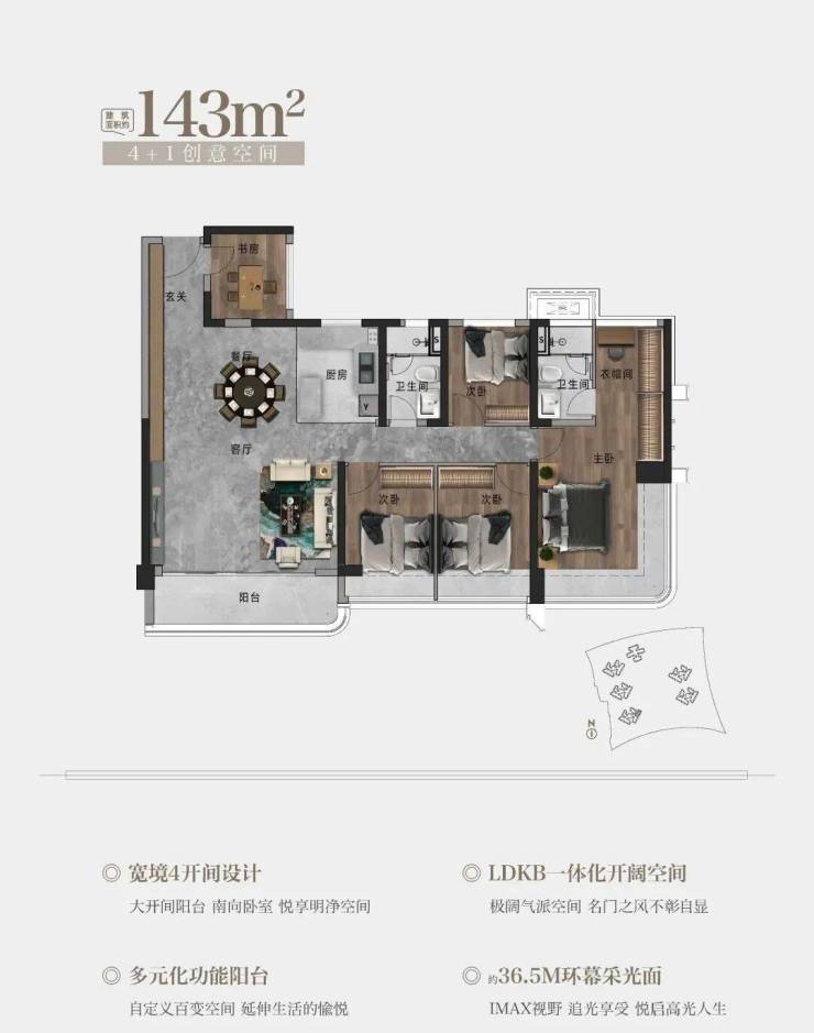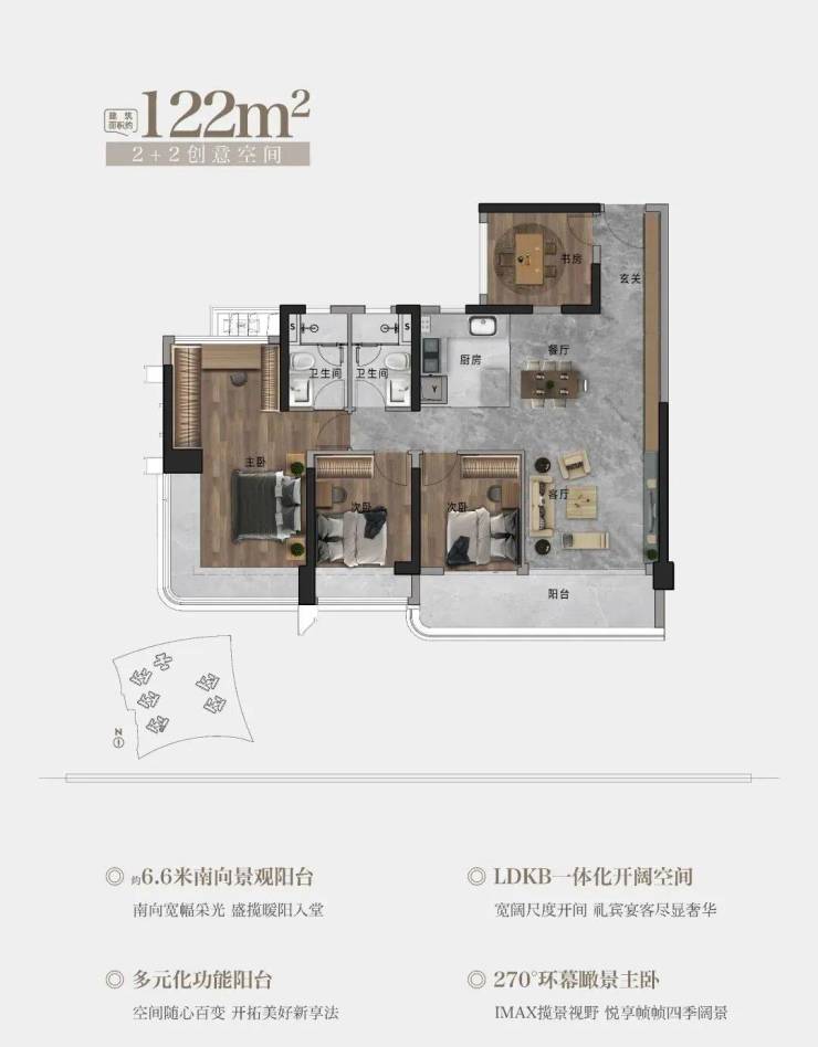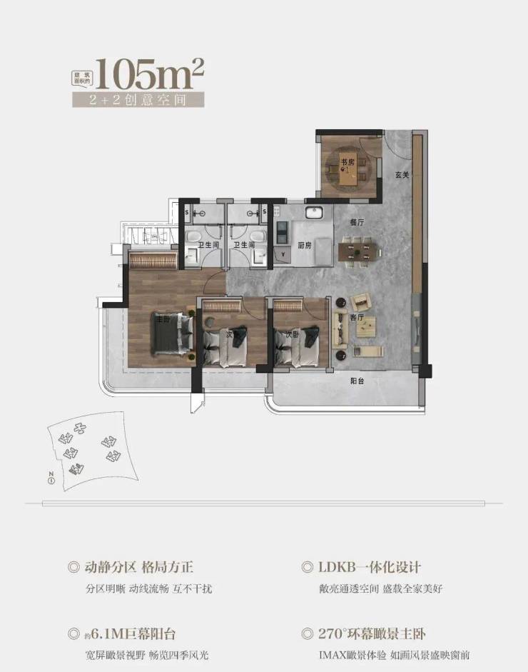 首推的D座为47层3梯6户设计,不分户型均做到3.05米层高,空间通透感拉满。主力105㎡户型很亮眼,配备6.1米巨幕阳台和270°环幕瞰景主卧,LDKB一体化设计让公共区域更开阔,日常家庭互动或朋友小聚都很从容。
