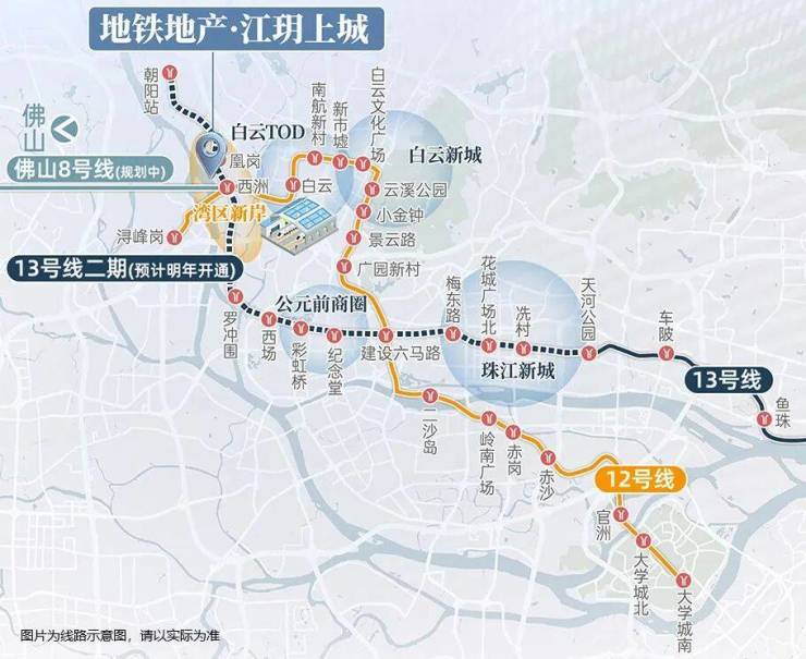 江玥上城交通极为便利,三地铁交汇,构建起便捷的出行网络。地铁 12 号线(已开通)被誉为“换乘之王”,设有 18 个换乘站,可对接 15 条线路,2 站即可达白云站,10 站到达珠江新城。地铁 13 号线(2026 年通车)串联白云、荔湾、越秀、天河,约 30 分钟直达珠江新城,被称为“财富列车”。佛山 8 号线(规划中)无缝衔接广佛,5 站可达千灯湖,拓宽了跨城生活边界。此外,项目距离白云站约 3 公里,可享受枢纽带来的高铁、城际、地铁多维交通,1 小时直达深圳、佛山、东莞,轻松融入湾区 1 小时生活圈,快捷的交通将带动板块产业腾飞。
